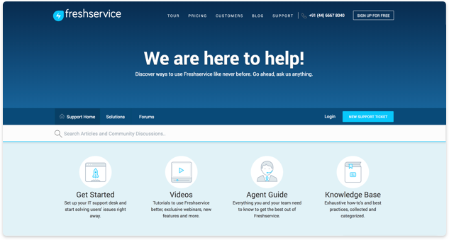 Choosing a service desk is not a small decision. It’s probably one of the biggest investments you will make as an IT person. It’s pivotal that your ITSM vendor supports you in every step, and becomes a co-owner of your success. That’s exactly what you get with Freshservice. We’re here to support you round the clock - on phone, email, chat and with an exhaustive self service portal! Our support comes with a ‘no-strings attached’ approach and is independent of the plan you’re in.