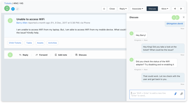 Freshservice is built for the workforce of today. That’s precisely the reason why we built a ton of collaborative features. With our team huddle feature, your agents can collaborate and work on a ticket together without having to switch tools or move away from your service desk. You can now collaborate on tickets without losing context and help your users more efficiently.