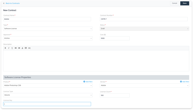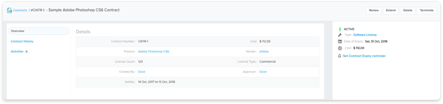 Maintain a complete record of all your organization’s contracts with third-party vendors. Track contracts for lease, maintenance, software licenses, or even custom contract types suitable for your business throughout its lifecycle.